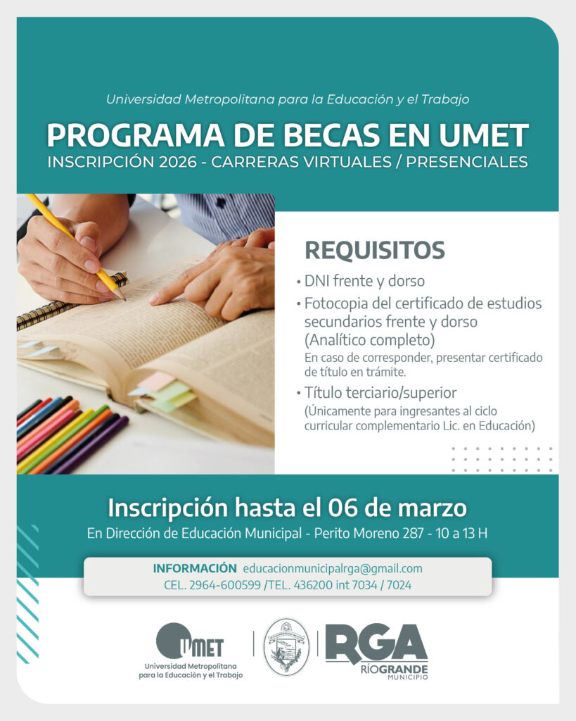 El Municipio de Río Grande informa que se encuentran abiertas las inscripciones al Programa de Becas 2026 para cursar carreras virtuales y presenciales en la Universidad Metropolitana para la Educación y el Trabajo (UMET), en el marco del convenio vigente entre ambas instituciones.