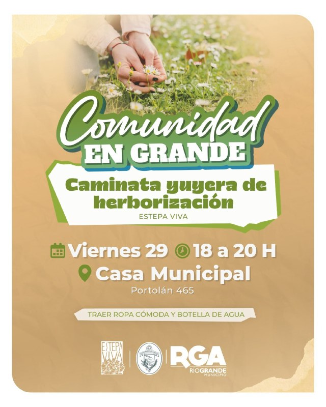 Este viernes 29 de agosto, de 18 a 20 horas, se realizará la Caminata Yuyera de Herborización, una propuesta enmarcada en el ciclo de actividades “Comunidad en Grande”, organizada por el Municipio de Río Grande a través de la Secretaría de Gestión Ciudadana, junto a Estepa Viva.