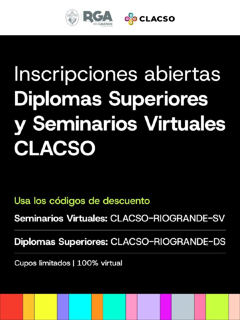 El Municipio de Río Grande continúa promoviendo el acceso a la formación y el conocimiento como herramientas claves para el desarrollo de la comunidad. En este marco, y a partir de un convenio de cooperación con el Consejo Latinoamericano de Ciencias Sociales (CLACSO), se encuentran disponibles beneficios formativos para acceder a Diplomas Superiores y Seminarios Virtuales en modalidad 100% virtual.