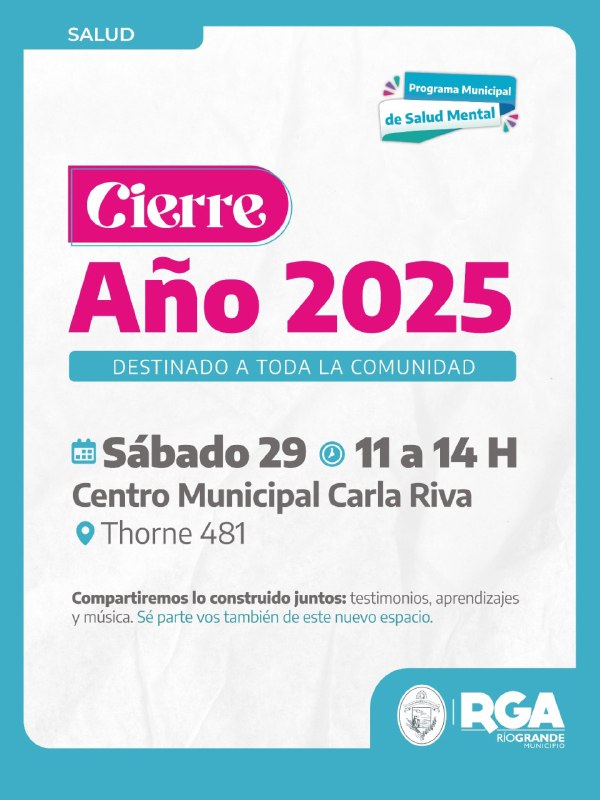 El Municipio de Río Grande llevará adelante el cierre del año en el Centro Municipal Riva, espacio que trabaja en el acompañamiento y atención de personas atravesadas por situaciones de consumo problemático. La actividad tendrá lugar el sábado 29 de noviembre, de 11 a 14 horas, en Thorne 481, esquina Lasserre, y está destinada tanto a usuarios del dispositivo como a familiares y vecinos que deseen conocer más sobre el trabajo de dicho espacio.