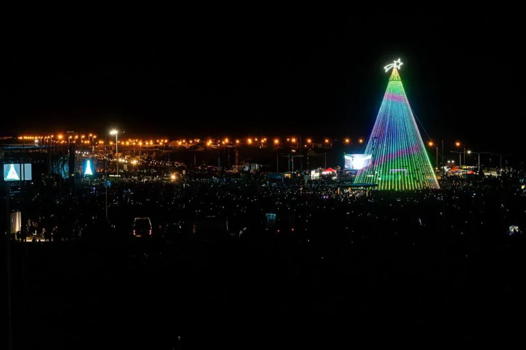 A la medianoche, el esperado momento llegó: el árbol de Navidad iluminó el cielo de Río Grande con su imponente figura y tecnología LED de última generación, un espectáculo que dejó a todos maravillados.