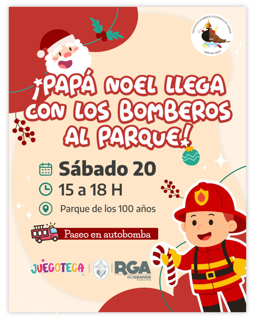 Durante la tarde del sábado 20 de diciembre, el Municipio de Río Grande acompaña a los Bomberos Voluntarios que estarán presentes con Papá Noel en el Parque de los 100 Años de 15 a 18 horas. Las y los niños que se acerquen podrán conocer el interior de un autobomba.