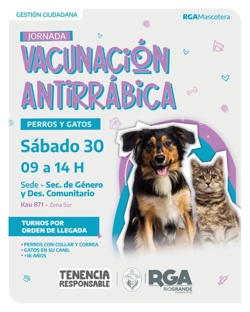 El Municipio de Río Grande, a través de la Secretaría de Gestión Ciudadana, llevará adelante una nueva jornada de vacunación antirrábica para mascotas, que se realizará el sábado 30 de agosto, de 9 a 14 horas, en la sede de la Secretaría de Género y Desarrollo Comunitario de zona sur, ubicada en Kau 871.