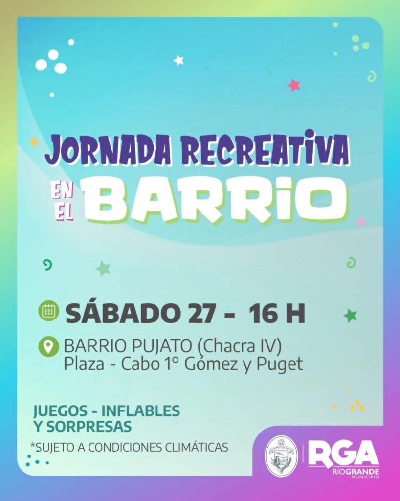 Con el objetivo de acercar el deporte y la recreación a cada barrio de la ciudad, el Municipio de Río Grande invita a la comunidad a participar de la Jornada Recreativa en el Barrio. La misma será el sábado 27 de diciembre en la plaza ubicada en Cabo 1º Gómez y Puget del B° Pujato (Chacra IV).
