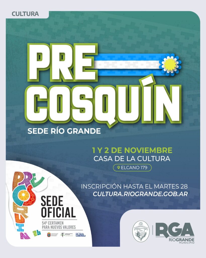 El Municipio de Río Grande invita a los y las artistas del folklore de nuestra región a ser parte del gran festival “Pre Cosquín 2026” en su 54° certamen para nuevos valores, evento que se realizará el 1° y 2 de noviembre en nuestra Casa de la Cultura (Elcano 179).