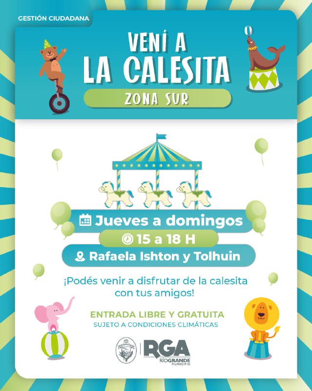 El Municipio de Río Grande informa a las familias que se encuentra habilitada la Calesita de zona Sur, ubicada en la intersección de las calles Tolhuin y Rafaela Ishton.
